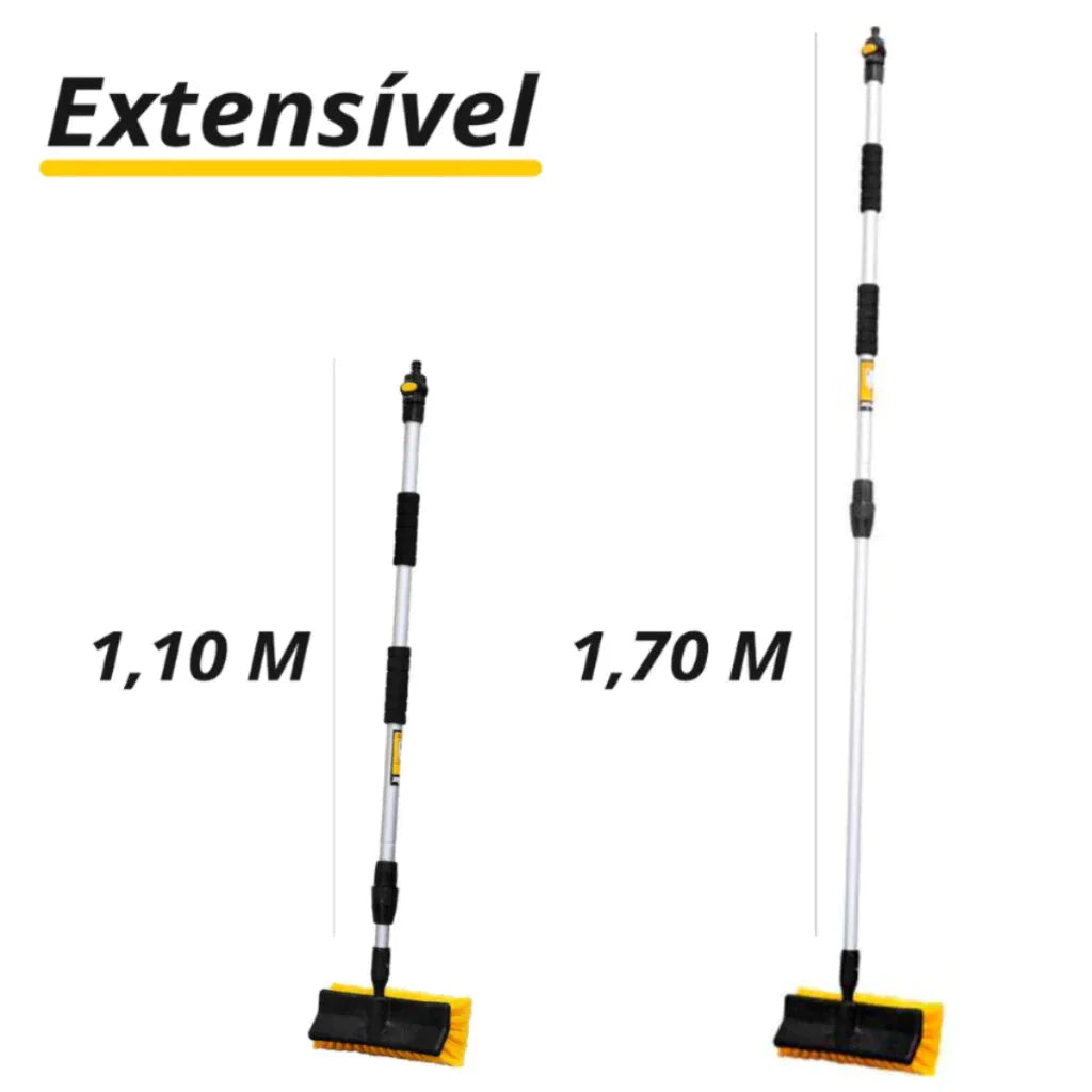 A Vassoura com Cabo Extensível (1,10m a 1,70m) foi criada para tornar a limpeza de superfícies altas e amplas muito mais prática e eficiente. Com jato de água integrado, ela remove sujeiras persistentes em placas solares, vidros, paredes e telhados, garantindo resultados impecáveis com o mínimo de esforço.