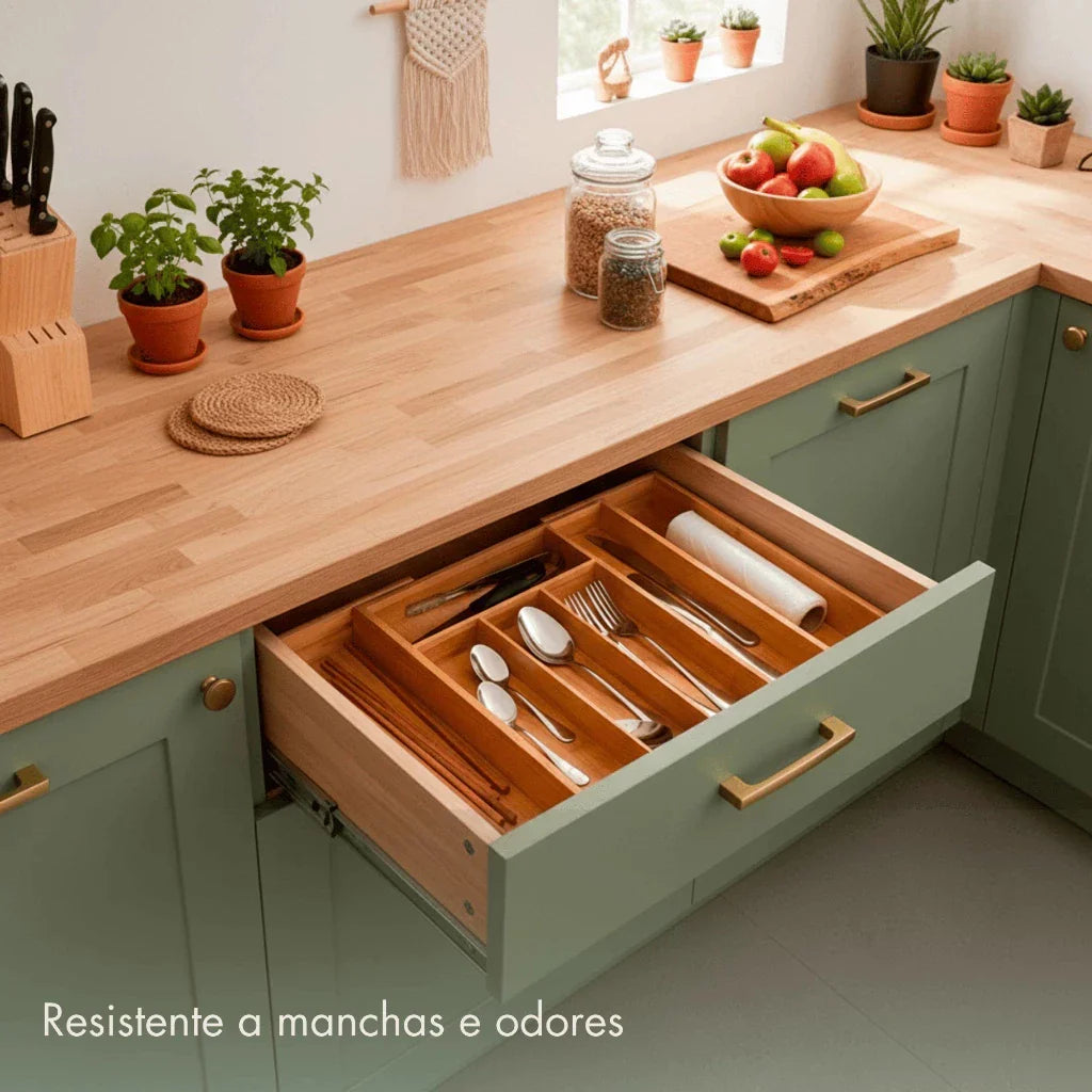 Perfeito para gavetas grandes e planejadas, o Porta-Talheres Extensível otimiza o espaço interno e mantém tudo em ordem. Uma peça essencial para quem valoriza praticidade e estética natural na decoração da cozinha.